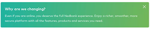 A word-class online banking platform that puts you in control of your finances and enables you to manage your accounts from the comfort of your home or office. Already using the Nedbank Money (Africa) app? Enjoy the same look and feel when using either banking platform.